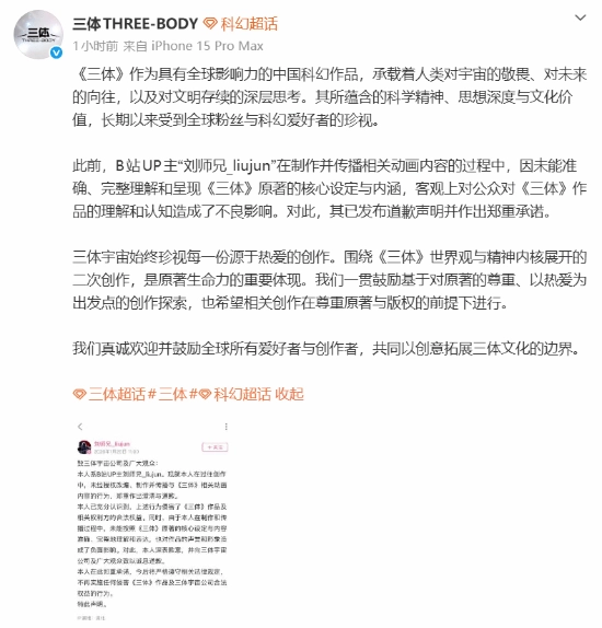 此前,B站UP主“刘师兄_liujun”在制作与传播相关动画内容时,由于未能精准、全面地理解和呈现《三体》原著的核心设定及内涵,在客观上给公众对《三体》作品的理解与认知带来了不良影响。针对此事,该UP主已发布道歉声明并作出郑重承诺。