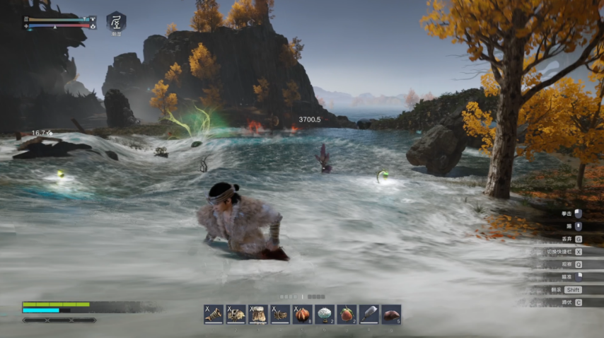 不仅如此,Demo地图里的制高点还有一个能改变天气的交互区域。玩家抵达这个交互区域后,就能把游戏世界的天气强行切换成“暴雨”模式。这时候地图上的水源会快速增加,山间的天然堤坝也会积聚起洪水。要是玩家趁这个时机,用地图里的爆炸物炸开“堤口”处的岩石,就能触发“决堤”的效果——在这场灾害面前,玩家和地图里的所有生物都被平等对待,玩家建造的建筑和敌方的据点都有可能被洪水冲毁。而地图中央的火属性Boss,更是会被汹涌的山洪直接秒杀,让那些仔细研究过机制的玩家可以直接跳过整场Boss战。