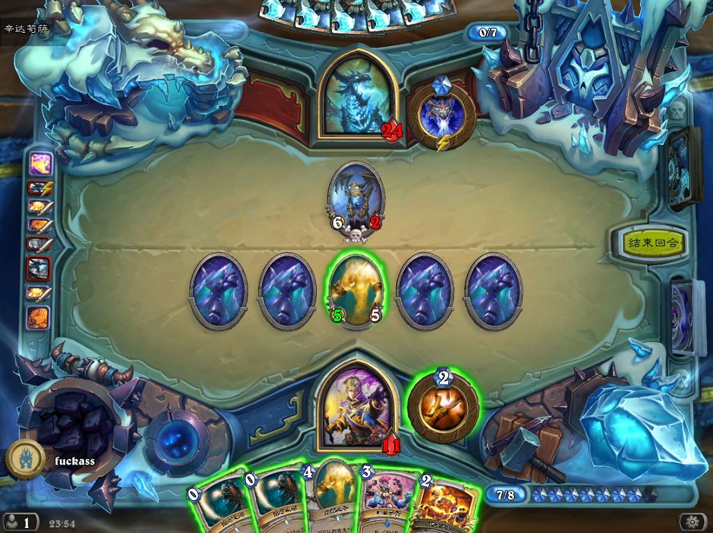 为什么我们要组这样一套卡牌呢?首先,我们的场地被四个冰块挡住了,这就意味着没办法组靠铺场取胜的卡组。这时候可能有人会想到法师的卡组,但辛达苟萨有一张一费法术牌叫狂咒,效果是如果对手手牌里有法术牌,每有一张就会受到三点伤害,所以像奥秘法这类套牌是行不通的。